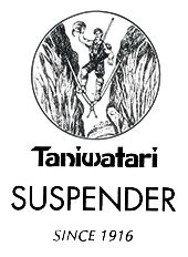 Taniwatari とは、漢字に表すと字のごとく「谷渡り」。この名前の由来は、サスペンダーの強度を試すため海軍将校が背中のバーツを足で踏みつけ両手でひっぱり、その強度に満足し「これなら谷を渡るときにも役立ちそうだ。」と言ったことから、ニッカボッカを履いた猟師がサスペンダーを踏んで谷を渡る商標が生まれました。